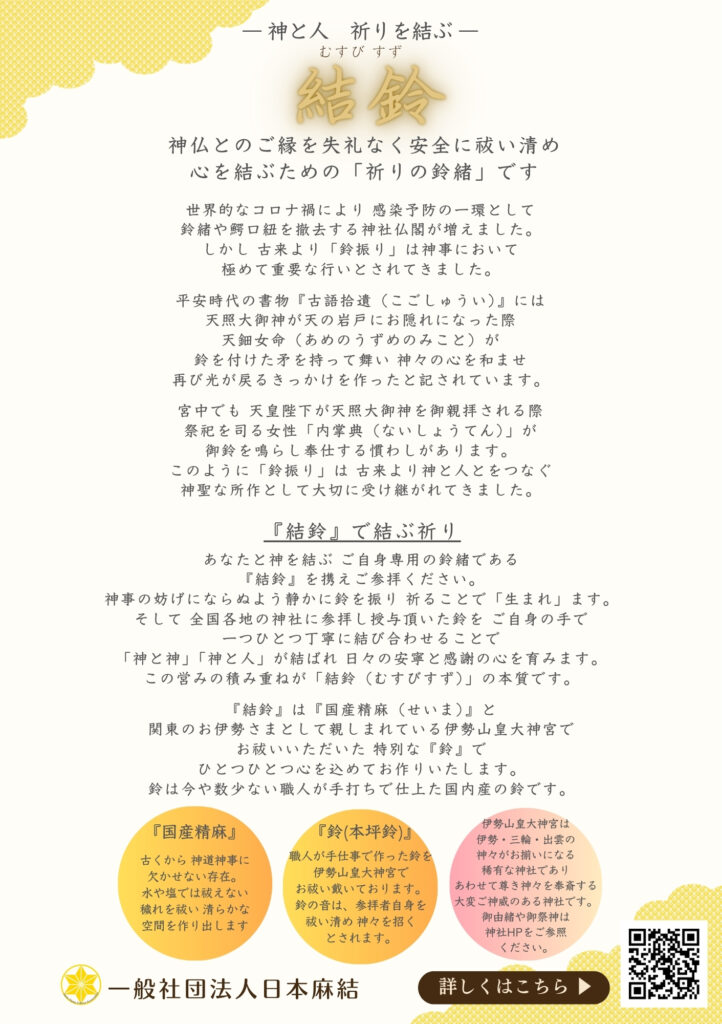 古来より麻は神聖な植物とされ、水や塩では祓えない穢れを祓う力があると伝えられています。